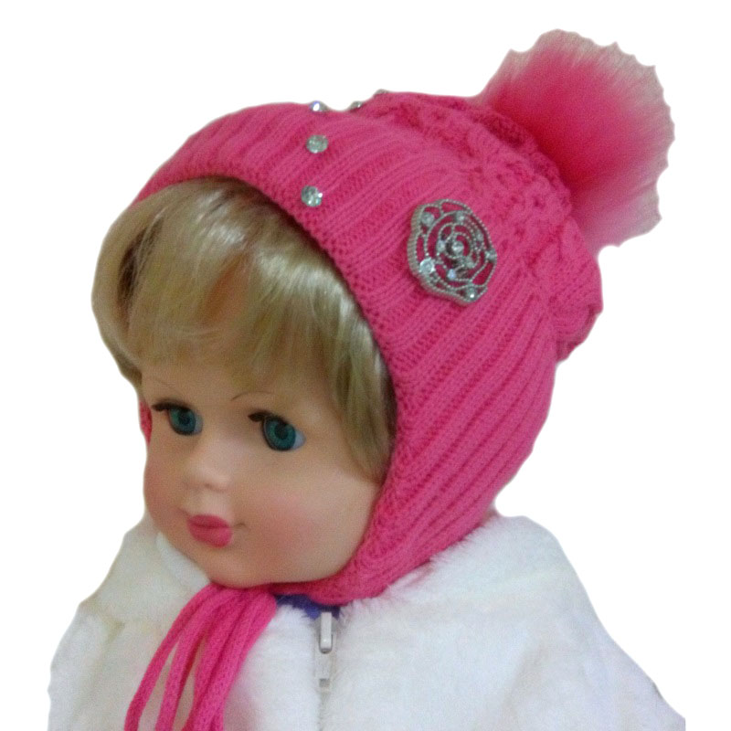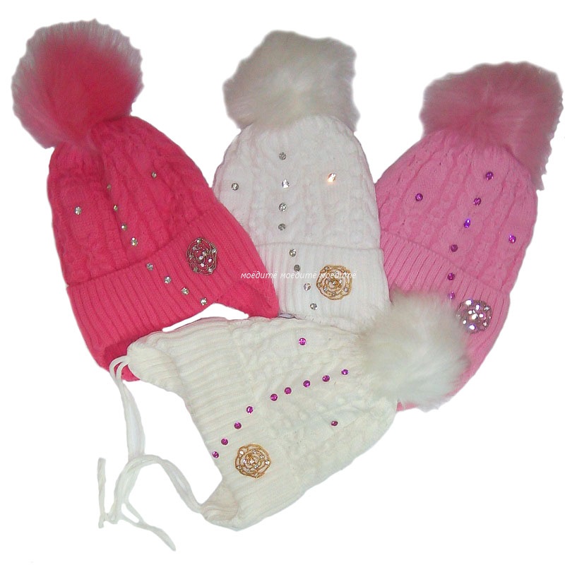 В упаковке 5 штук одного размера и вида, разного цвета. Шапочка вязаная с завязками, с помпончиком из меха, на подкладке из велсофта. Очень тёплая. Размер шапочек на 3-5 лет.